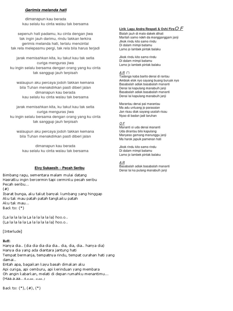 Hye guys Kalau korang ada nak lirik lagu kegema. Tiada terhenti gerimis hati. Lirik Lagu Gerimis Melanda Hati dimanapun kau berada kau selalu ku cinta walau tak bersama sepenuh hati padamu ku cinta dengan jiwa tak ingin jauh darimu rindu takkan terkira gerimis melanda hati terlalu mencintai tak rela melepasmu pergi tak rela bila harus terjadi jarak memisahkan kita ku takut kau tak setia curiga menguras jiwa.